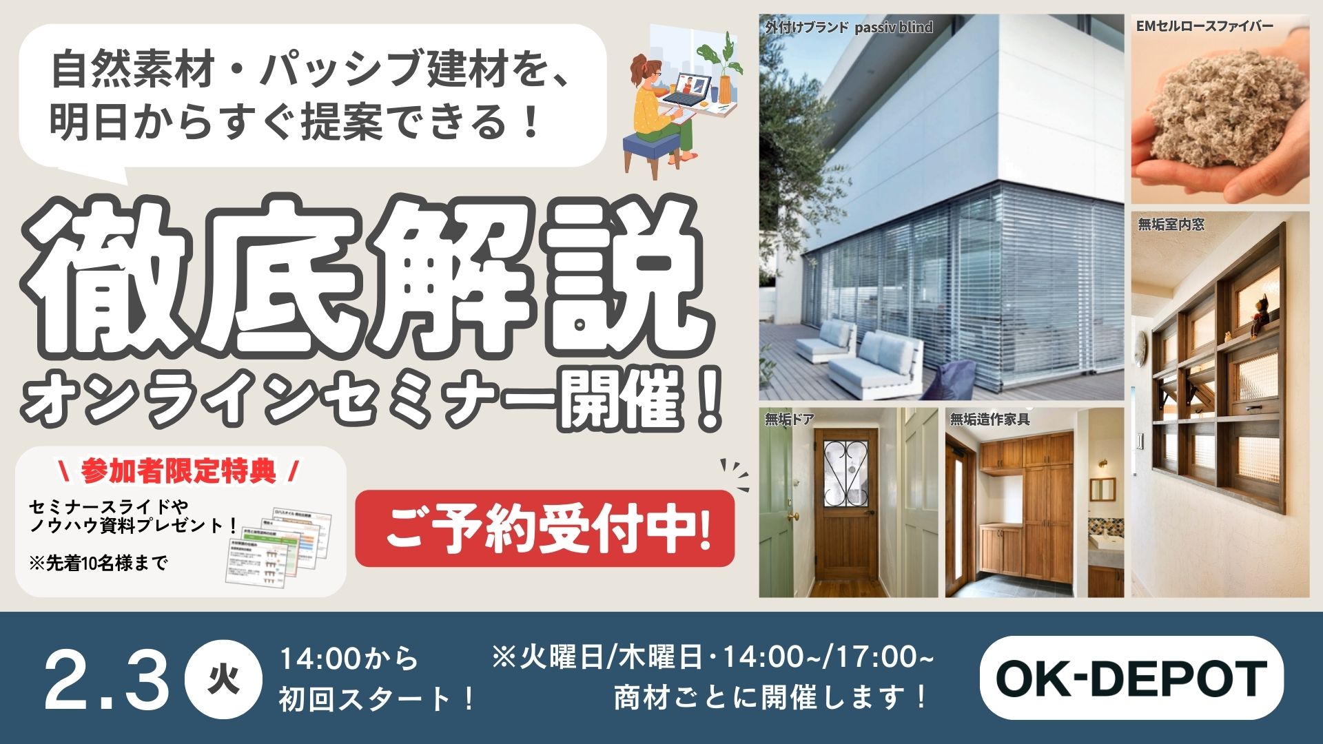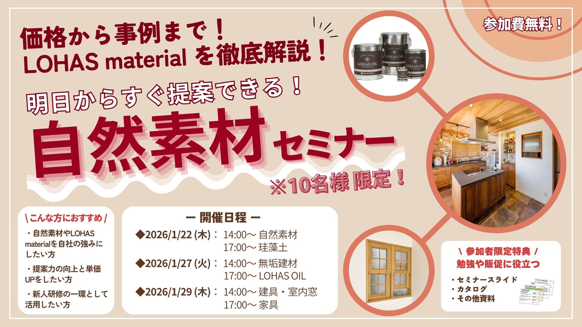 2026年1月22日~建築会社様を対象とした【LOHAS material 建材の徹底解説セミナー】を開催いたします。ふるってご参加ください!>>>詳細はこちら