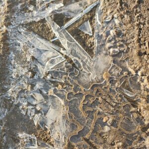前日の雨の水たまりに、うっすら氷がはっていました。