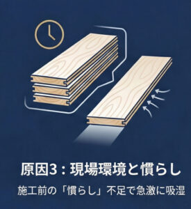 工場で日本の住宅環境に適した含水率まで適切に乾燥されたフローリング材も、湿度の高い現場に搬入されすぐに施工すると、急激に湿気を吸って膨張し、床鳴りを起こしやすくなります。