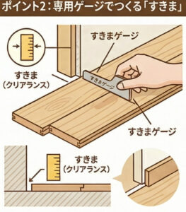 このわずかな隙間が、夏場に木が膨張した際の「逃げ場」となり、突き上げを防ぐ重要な役割を果たします。同様に、壁際にも3~5mm程度のクリアランス(隙間)を設けることが定められています。