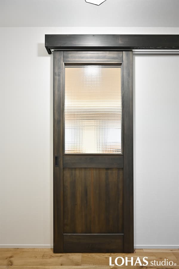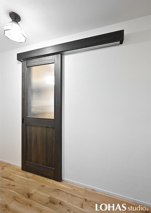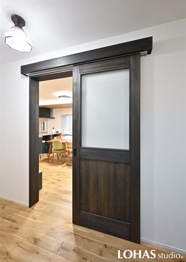 【施工事例】無垢建具 室内ドア アウトセット上吊り片引き戸 パイン ブラック塗装