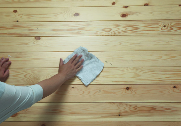 「米蝋」を原液のままウエス(布)等に含ませ、フローリングを磨く感覚で拭いてください。