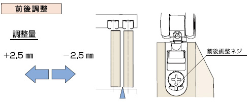 引き戸本体中方立や、ひき違い戸同士が擦れる時は、上吊金物のローラー部分の「前後調整ネジ」を使って調整します。