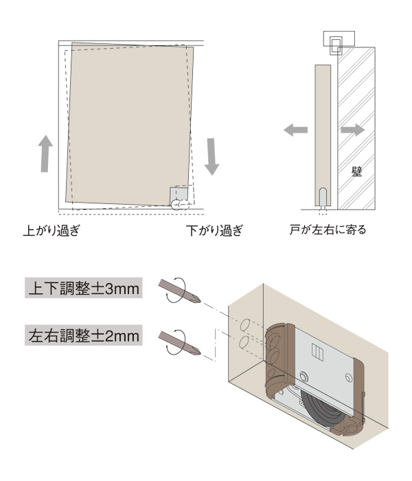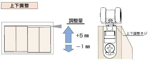 引き戸本体が床や上枠擦れる時は、上吊金物のローラー部分の「上下調整ネジ」を使って調整します。