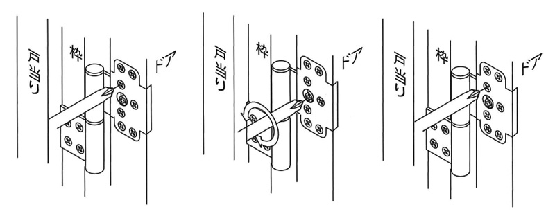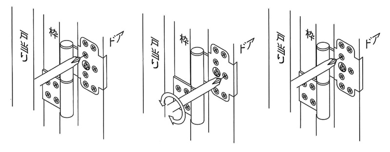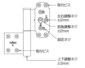 - 内側に回すとドアが戸当たり側に寄り、外側に回すとヒンジ軸側にドアが寄ります。